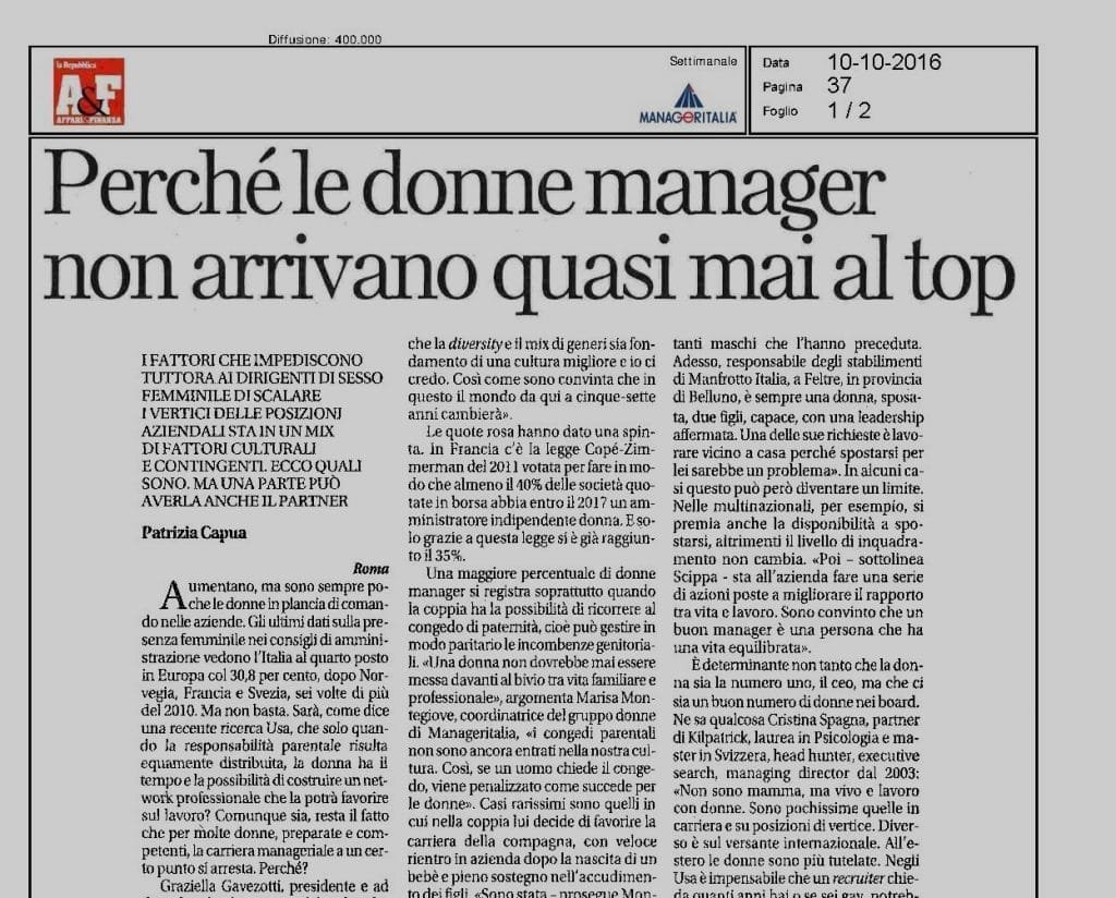 Interview to Cristina Spagna – Managing Director Kilpatrick Italy by Patrizia Capua – La Repubblica A&F While the barriers preventing female executives from climbing the